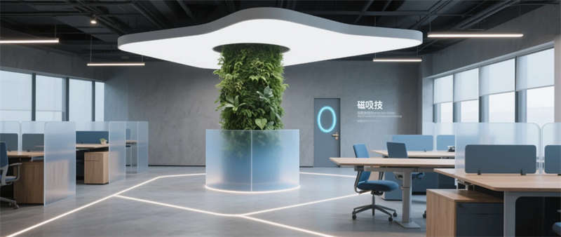 本項目以“未來生態(tài)辦公”為核心理念,打造1200㎡科技與自然交融的創(chuàng)新型辦公空間。設(shè)計采用啞光太空灰為主基調(diào),通過霧霾藍(lán)企業(yè)色原木紋理的碰撞,在冷峻科技感中注入人文溫度??臻g以微水泥地面為基底,貫穿透光亞克力陽極氧化鋁材質(zhì),配合隱藏式線性燈帶的流動光影,構(gòu)建出具有呼吸感的數(shù)字美學(xué)場域。