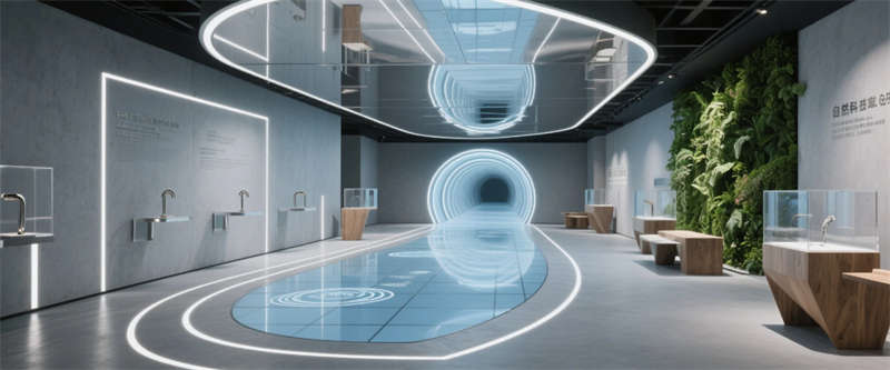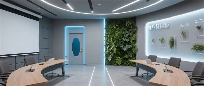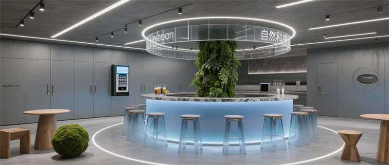 各區(qū)域通過四大統(tǒng)一性語言緊密串聯(lián):霧霾藍(lán)橢圓金屬門把手貫穿全空間,再生材料家具呼應(yīng)可持續(xù)發(fā)展理念,聲學(xué)墻面嵌入本地植物標(biāo)本強(qiáng)化生態(tài)屬性,智能燈光系統(tǒng)則通過4000K色溫線性燈帶實現(xiàn)晝夜場景的無縫切換。特別設(shè)計的全息投影展廳智能階梯會議室,通過LED交互地屏與AR懸浮展臺,將品牌科技基因融入空間體驗。