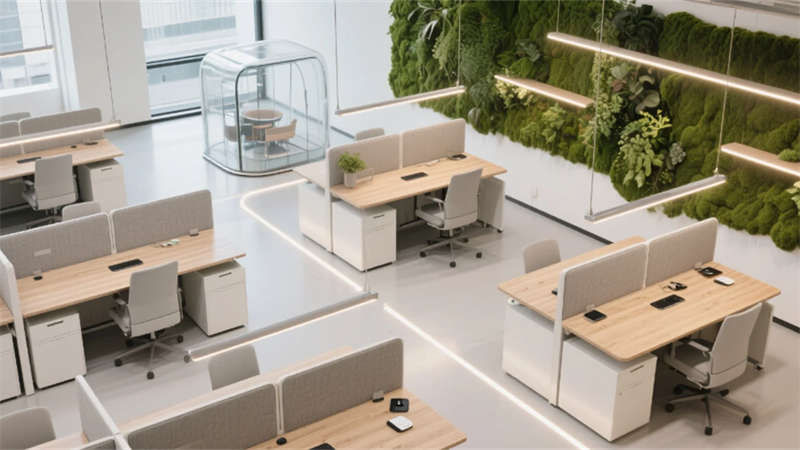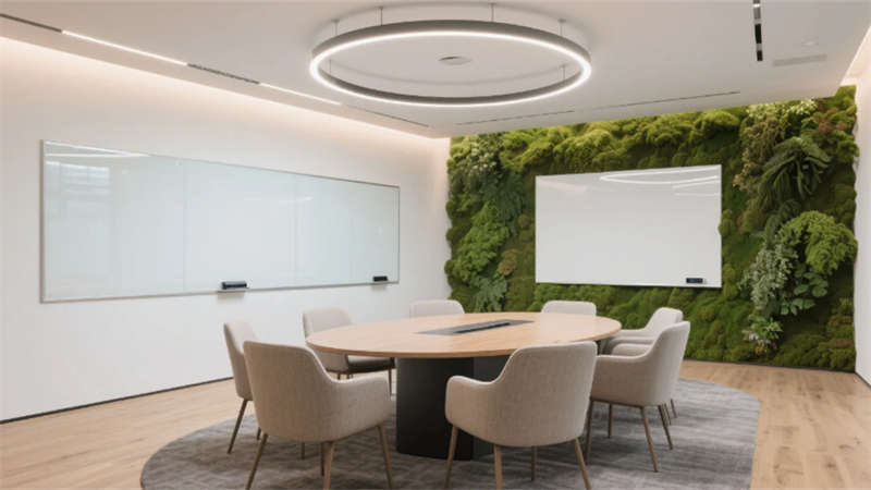 生態(tài)科技體系覆蓋全場景:經(jīng)理辦公室苔蘚墻集成空氣監(jiān)測系統(tǒng),總裁室霧化玻璃聯(lián)動(dòng)光伏發(fā)電,小會議室綠植墻搭載微滴灌節(jié)水裝置。材質(zhì)選用安徽本土元素升級再造,大廳水磨石摻入大別山礦石粉,定制地毯紋樣提取徽派窗欞數(shù)字化變體。