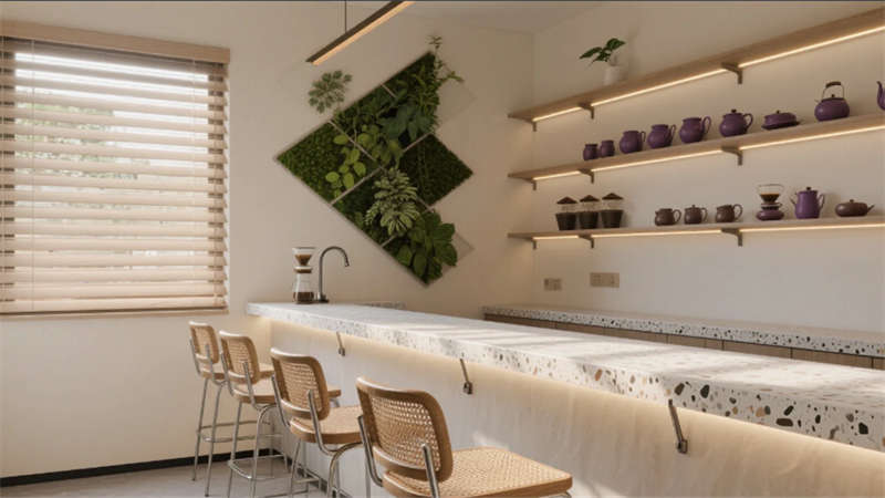 步入大廳,弧形亞麻沙發(fā)與編織地毯圍合出松弛場域,整面落地窗借景庭院竹影,琴葉榕與懸浮綠植墻形成立體生態(tài)敘事。多功能區(qū)以巢湖水波紋地毯呼應(yīng)地域脈絡(luò),壁爐旁的非遺火筆畫裝置暗藏城市文化密碼??Х劝商倬幾闻c水磨石臺面碰撞,幾何綠植墻在百葉光影中演繹晨昏詩意。
