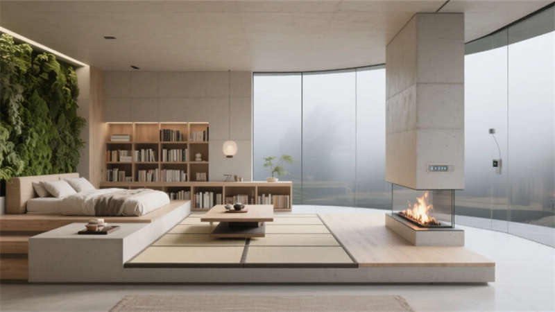 客房以極簡的智慧回應(yīng)棲居本質(zhì)。榻榻米地臺消弭床與地面的界限,270°環(huán)景霧化玻璃輕觸即透,仿生綠植在智能光影中呼吸生長,隱藏式投影幕布落下時,星空與林海皆成私享背景。階梯書吧的垂直綠植墻下,模塊化沙發(fā)隨需求自由組合,全息粒子在空氣中勾勒出流動的藝術(shù),而巖板中島餐廳里,藤編座椅與吊燈矩陣的光暈交織,智能調(diào)光天窗讓每一餐都浸染著天光的溫度。