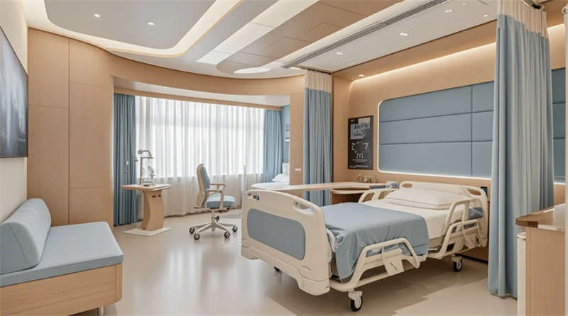 門診大廳以8米挑高空間構(gòu)建醫(yī)療門戶形象,曲面導(dǎo)診臺(tái)與智能分診系統(tǒng)形成高效服務(wù)樞紐,木紋格柵吊頂與綠植景觀墻弱化傳統(tǒng)醫(yī)院的冰冷感。兒科診區(qū)創(chuàng)新運(yùn)用馬卡龍色系與云朵軟包墻面,互動(dòng)投影游戲區(qū)搭配動(dòng)物主題診療設(shè)備,構(gòu)建兒童友好型醫(yī)療環(huán)境。VIP病房采用全景落地窗與智能護(hù)理系統(tǒng),可變形家具滿足陪護(hù)與康復(fù)雙重需求,展現(xiàn)高端醫(yī)療的溫度感。