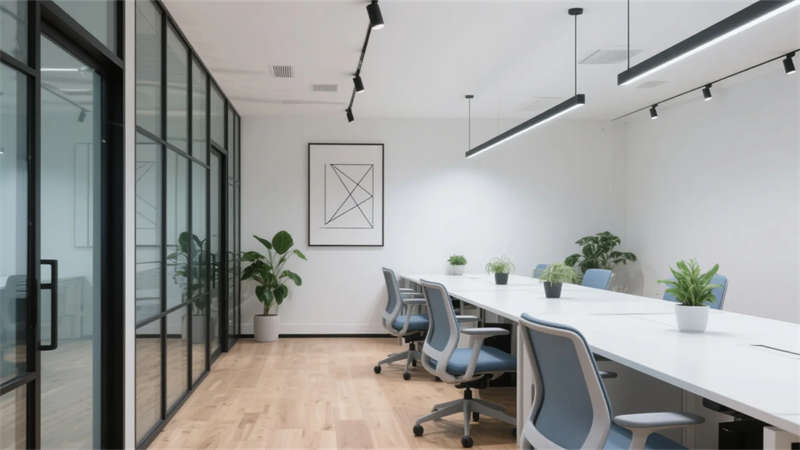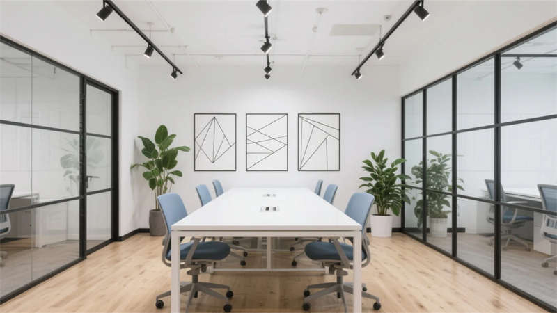 該辦公空間以現(xiàn)代簡(jiǎn)約主義為基調(diào),摒棄冗余裝飾,通過(guò)材質(zhì)本真與光影韻律構(gòu)建理性而溫潤(rùn)的場(chǎng)域。開(kāi)放式布局打破傳統(tǒng)隔閡,淺木色地板與純白立面奠定寧?kù)o氛圍,黑色金屬框架勾勒結(jié)構(gòu)張力,形成流動(dòng)的視覺(jué)節(jié)奏。