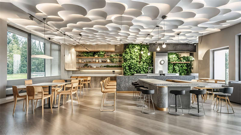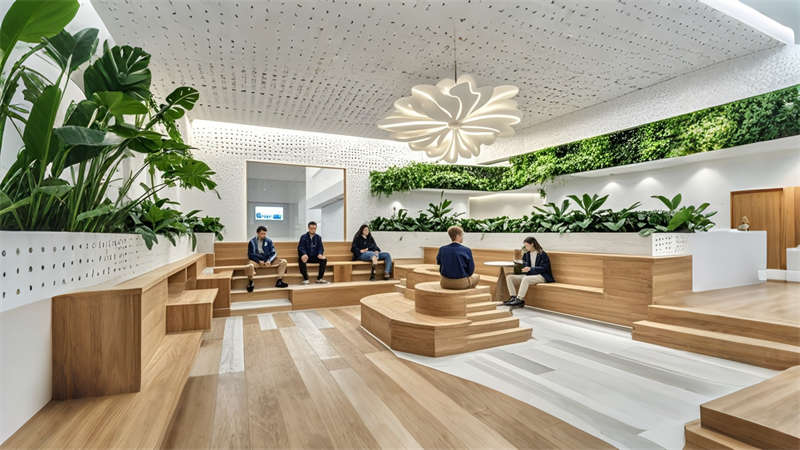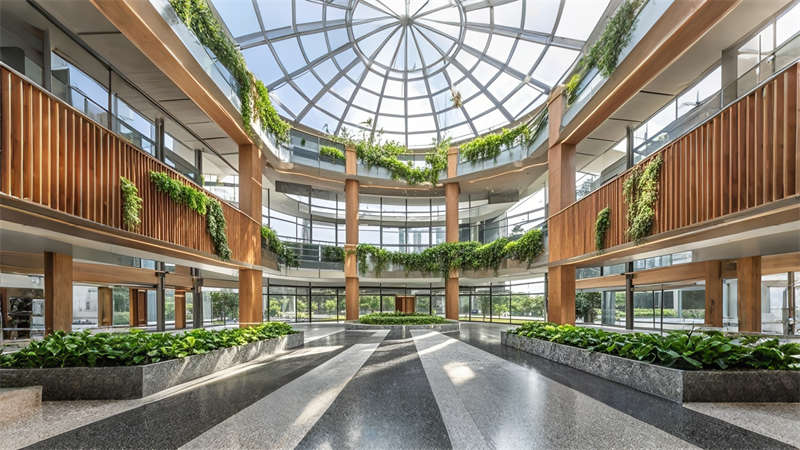 1)中庭三層挑空綠植墻構建垂直生態(tài)系統(tǒng),改善室內(nèi)空氣質(zhì)量;