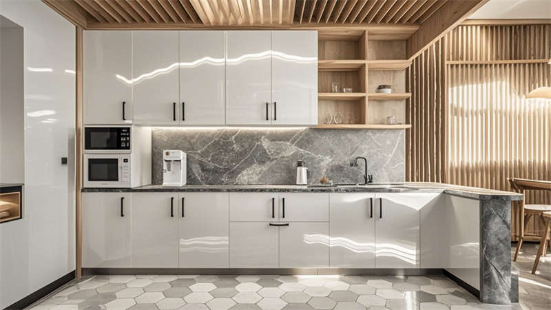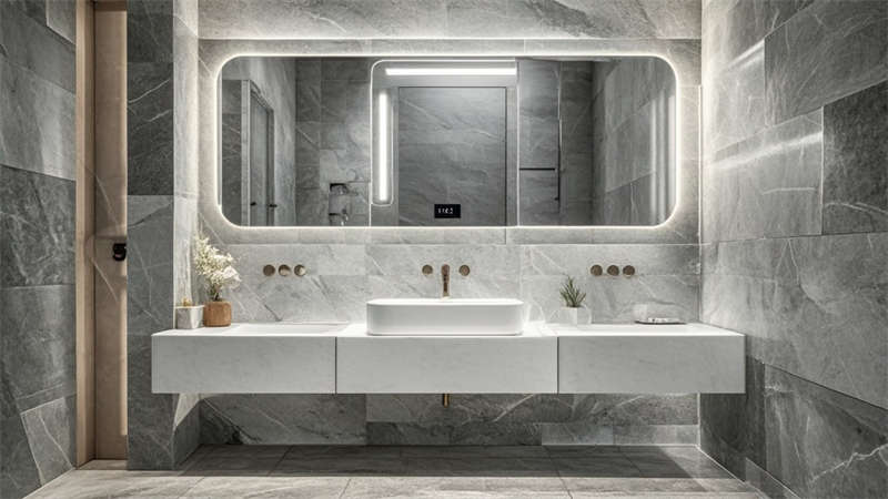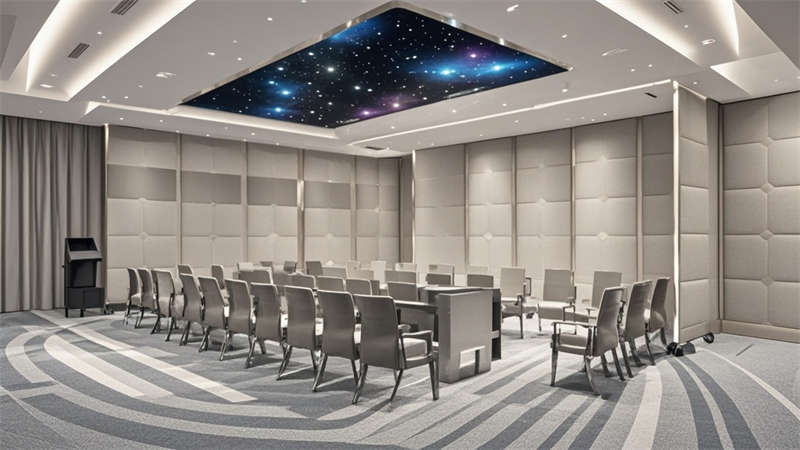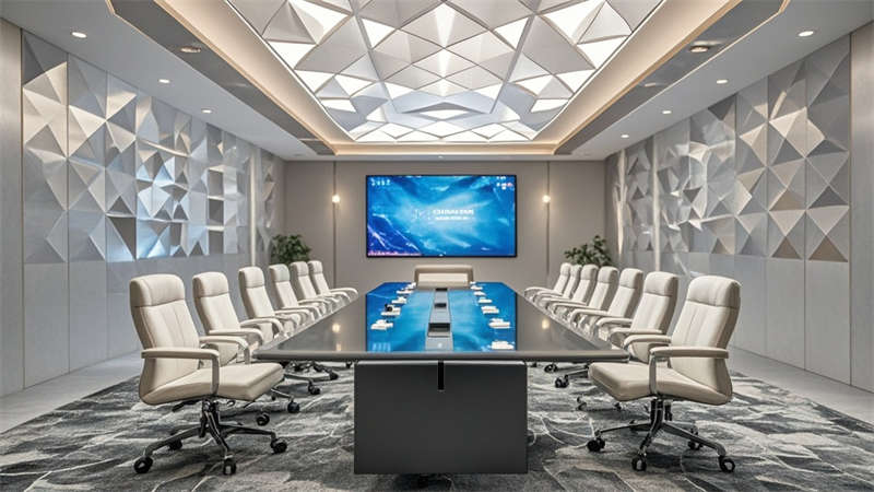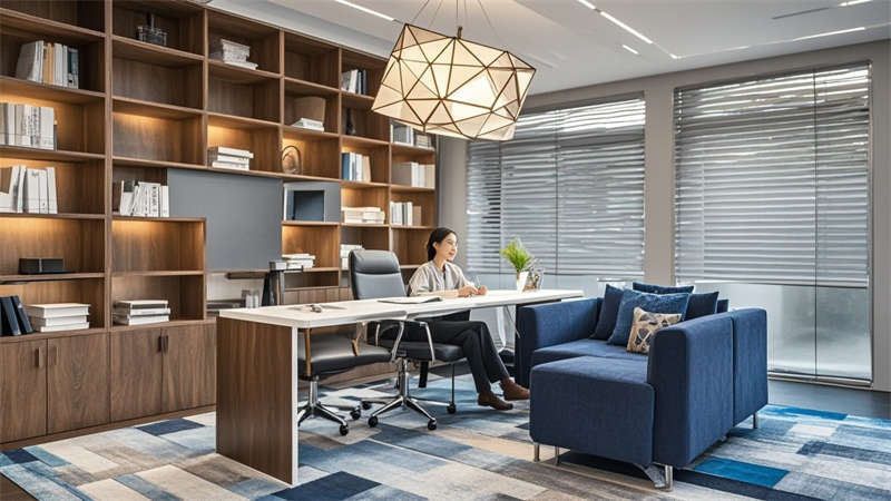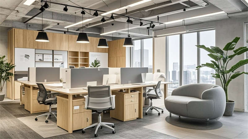 辦公區(qū)采用模塊化布局,配置智能升降桌和人體工學(xué)椅,裸頂噴灰工藝結(jié)合軌道燈系統(tǒng)實(shí)現(xiàn)靈活照明。色彩體系以高級(jí)灰為基底,搭配原木色系緩解視覺(jué)壓力,局部采用深藍(lán)跳色增強(qiáng)空間層次。材質(zhì)運(yùn)用注重環(huán)保性能,墻面大量使用穿孔吸音鋁板,地面采用防滑地膠與靜音地毯組合。