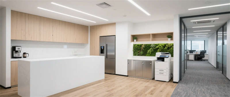 高管辦公室通過灰玻霧化膜實現(xiàn)私密與通透的辯證,胡桃木辦公桌與深灰沙發(fā)組演繹商務(wù)美學(xué),隱藏式智能控制系統(tǒng)將科技感融于無形??萍紩h室創(chuàng)新采用環(huán)形桌體與360°攝像系統(tǒng),陣列麥克風與補光燈帶打造沉浸式遠程協(xié)作場景。從光伏玻璃幕墻到模塊化綠植系統(tǒng),從智能升降辦公桌到節(jié)能設(shè)備集群,每個細節(jié)都銘刻著可持續(xù)發(fā)展的空間基因。