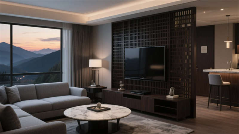 餐廳以工業(yè)風吊燈與綠植墻碰撞出活力氛圍,開放式取餐臺與大理石餐桌彰顯品質;行政套房客廳通過L型布藝沙發(fā)、木格柵電視墻與山景落地窗,打造出私享化的社交場景。