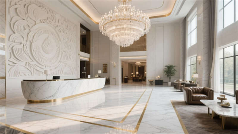 步入挑高8米的大堂,巨型水晶吊燈如銀河傾瀉,與白色大理石地面的金色脈絡相呼應;立體浮雕藝術墻融合傳統(tǒng)雕刻與現(xiàn)代光影,搭配皮質沙發(fā)與綠植造景,營造出兼具儀式感與松弛度的迎賓空間。