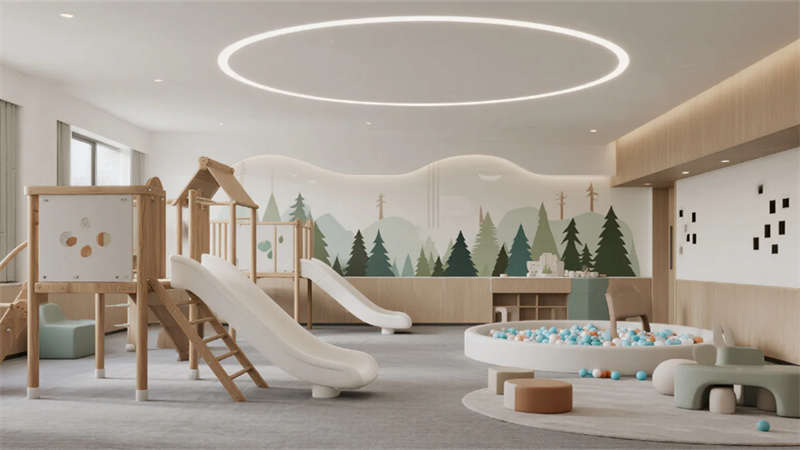 這座親子民宿以現(xiàn)代簡(jiǎn)約美學(xué)為靈魂,將自然元素與童趣設(shè)計(jì)無(wú)縫銜接??臻g摒棄繁復(fù)裝飾,選用淺木、純白與低飽和色彩鋪陳,弧形線條與柔和光影交織,營(yíng)造出寧?kù)o而溫暖的氛圍。從大堂的嵌入式動(dòng)物燈箱到套房的樹(shù)屋床鋪,每一處細(xì)節(jié)都暗藏親子互動(dòng)巧思,安全圓角家具與軟包地臺(tái)呵護(hù)孩童探索的每一步。
