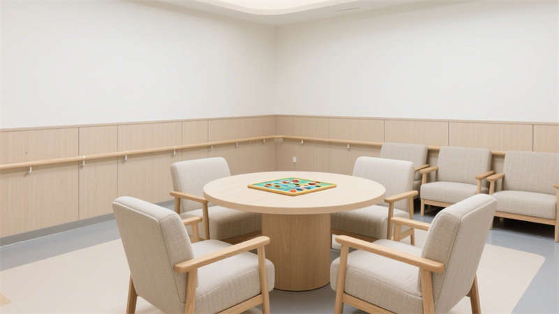 本設計聚焦養(yǎng)老院室內空間的適老化需求與現(xiàn)代審美融合,從居住者的實際生活場景出發(fā),打造兼具安全性與舒適度的環(huán)境。在公共活動區(qū)域,采用無高差地面設計,搭配防滑耐磨的地面材質,避免老人行走時發(fā)生磕碰或滑倒;墻面安裝便于抓握的扶手,扶手高度與間距經過精心考量,貼合老人起身、行走時的支撐需求,同時扶手外觀融入現(xiàn)代簡約線條,不顯突兀。?