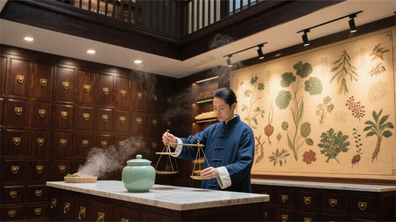 露天庭院白石鋪就太極紋路,素衣身影在紫竹霧靄間起勢推掌,漏窗剪出晨練動態(tài)。名醫(yī)診室紅木案上脈枕微溫,博古架藥材標本與滿墻醫(yī)典沉淀千年智慧。智慧煎藥中心的銅鍋陣列于胡桃木頂下吞吐蒸汽,光影交織傳統(tǒng)與現(xiàn)代。